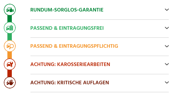 Entscheidest du dich für Alufelgen oder Kompletträder mit Passend & Eintragungsfrei, Passend & Eintragungspflichtig, Achtung: Karosseriearbeiten oder Achtung: Kritische Auflagen, prüft unser Team natürlich trotzdem jede Bestellung und schaut mit dir gemeinsam nach der besten Lösung, so dass du immer die Räder bekommst, die du gern möchtest.