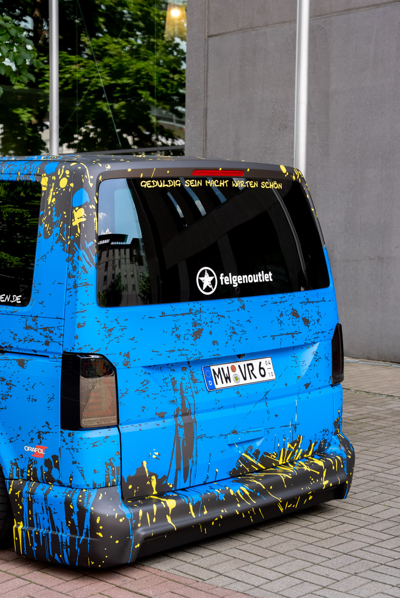 Was allerdings schon erledigt werden konnte, während sich das Lenkgetriebe 14 Tage im Umbau befand, war die Folierung des Busses. Inspiration für den wilden Farbverlauf fand Matthias über Pinterest an einem 6er Golf auf der Suche nach Digitaldrucken. Zweifelsohne eine Frage des persönlichen Geschmacks, doch wir sind begeistert. Nicht nur ist die Verarbeitung an sich extrem hochwertig, sondern beinhaltet auch Matthias‘ Lieblingsfarbe Blau und geht über in ein strahlendes Grün. Ein ähnliches Grün, welches man in den Nähten von dem in Leder gehülltem Handbediengerät und Schaltknauf wiederfindet, ist Matthias Erinnerung an die Wagenfarbe des ersten T5. Das zeigt wieder einmal, wieviel Sorgfalt und Überlegung in jede Modifikation fließt, die er am Auto vornimmt. Natürlich schadet es auch keineswegs, dass die R3 Wheels Felgen R3H08 in anthracite polished im Kontrast zum farbenfrohen Finish perfekt zur Geltung kommen.