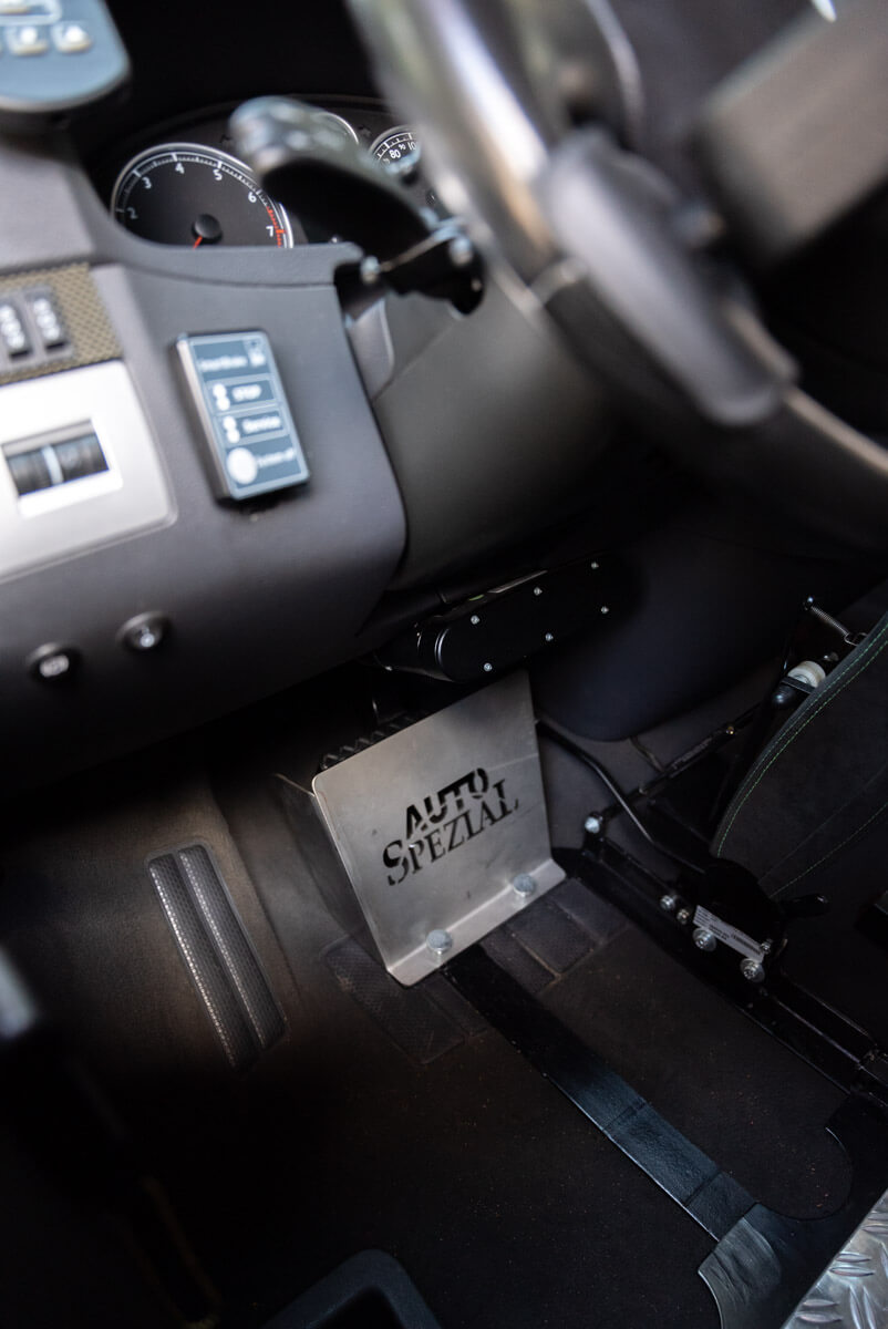Von außen scheint der T5 ganz normal, doch was sich im Inneren offenbart, ist verblüffend. Der gesamte Fahrerbereich ist genau auf Matthias angepasst. Das Standard-Lenkgetriebe wurde ausgebaut, von einer spezialisierten Firma umgebaut und anschließend wieder eingesetzt. Mithilfe der Lenkradgabel kann Matthias problemlos lenken, Gas und Bremse funktionieren über ein Handbediengerät. Dafür ist unter dem Armaturenbrett ein Dämpfer verbaut, der beim Nach-vorne-drücken aufs Bremspedal geht. Gespannt hören wir uns auch an, was es noch für Varianten für Lenkung, Schaltung, Auf- und Abblendfunktion, Gas und Bremse gibt – alles wird speziell nach den Fähigkeiten/Wünschen des Betroffenen (bzw. gemäß dem ärztlichen Gutachten der DEKRA) angepasst, eingebaut und anschließend von der technischen Prüfstelle abgenommen, wie Matthias weiß.