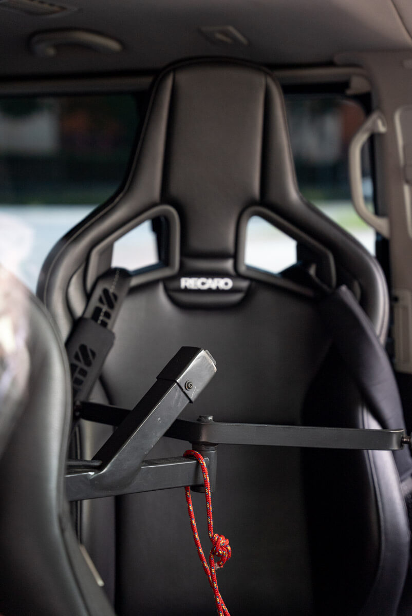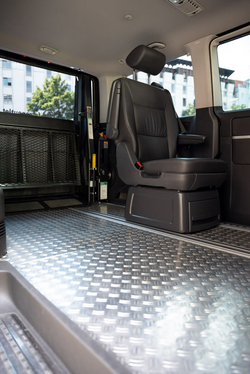 Wie man es von einem echten Autonarr nicht anders erwarten würde, dürfen neben der Funktionalität auch die Ästhetik und der Fahrspaß nicht zu kurz kommen. Kein Wunder also, dass sich im T5 bequeme Recaro-Sportsitze befinden. Mit dem modifizierten Personenlift kann sich Matthias schmerzfrei und ohne Hilfe vom Fahrersitz in den Rollstuhl heben lassen und anschließend über den blitzblanken Alu-Riffelboden nach hinten zum Ausstieg durch die Kofferraumklappe fahren. Wichtig ist in jedem Fall, dass der komplette rollstuhlgerechte Innenausbau vor allen anderen Veränderungen stattfinden muss, die auch die Elektrik und Kabel betreffen. Dazu zählt bspw. der Verbau eines Luftfahrwerkes, wie es bei Matthias der Fall ist.